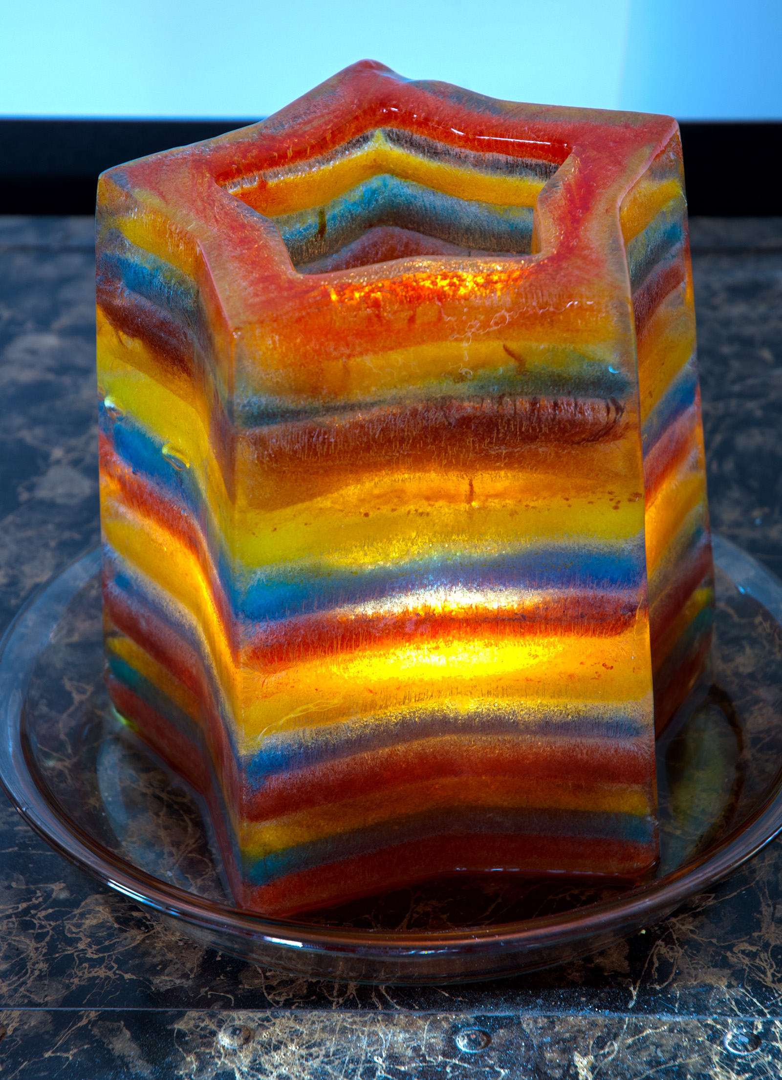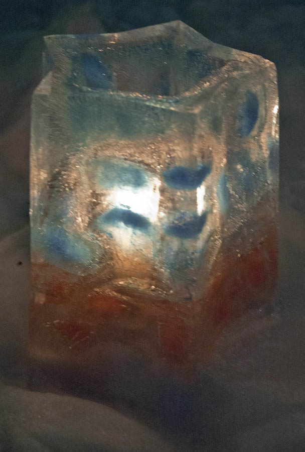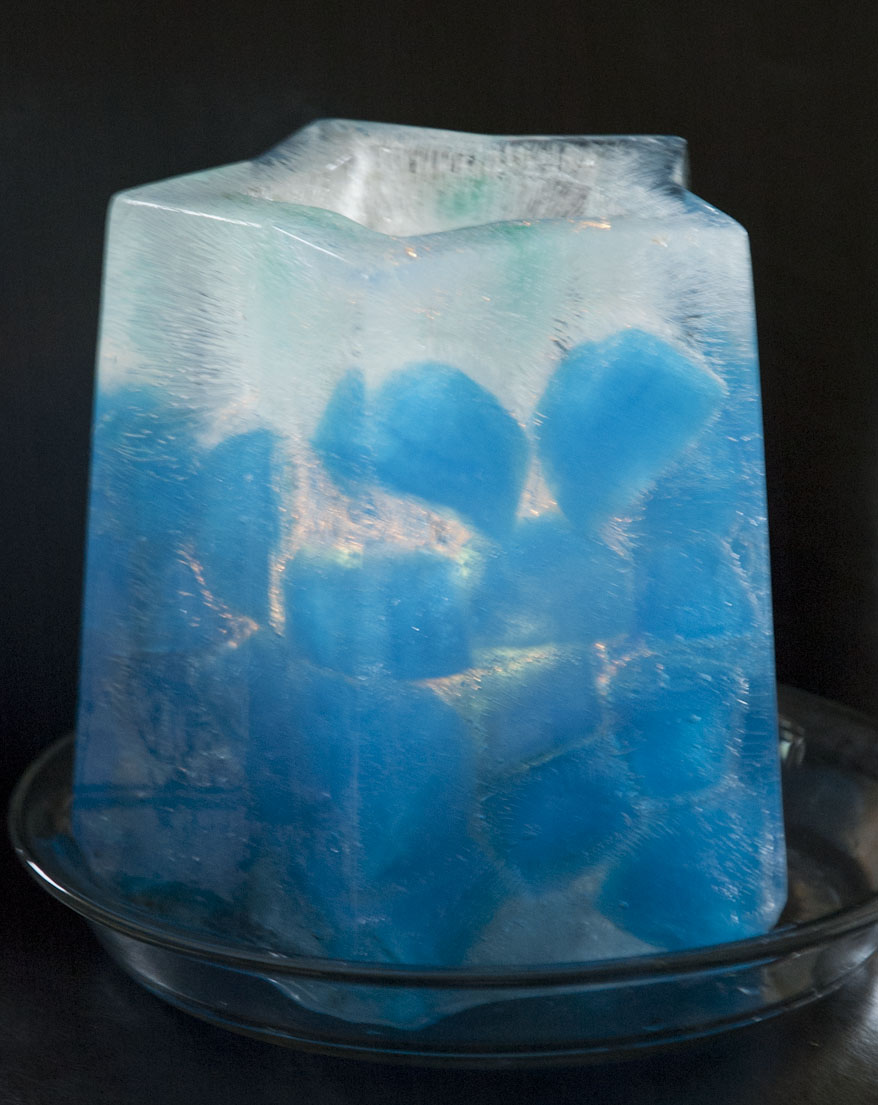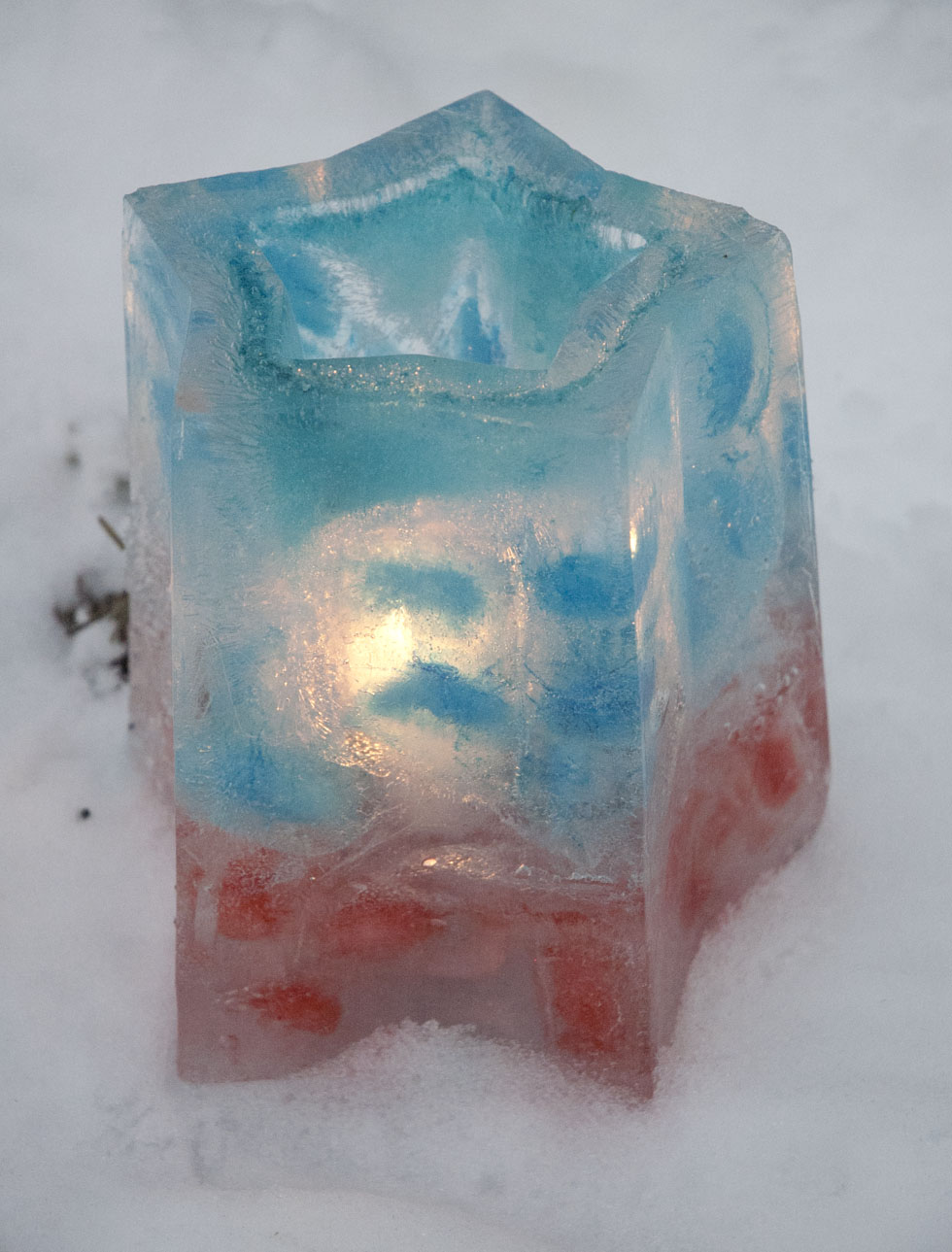 In blue and red. Used boiled water to reduce the air in the water. Added colored ice cubes in layers and topping up with water. Hard to tell that the color pieces are in the shape of ice cubes. The color cubes melted some when the clear water was added.