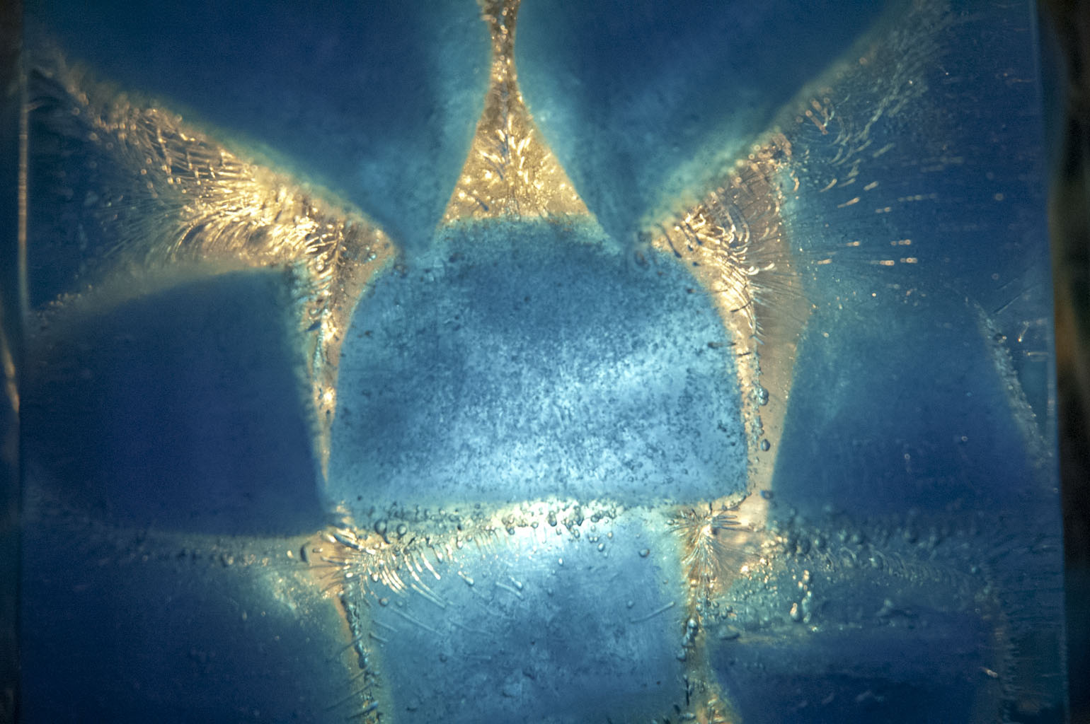 Used melted snow to get purer water. Boiled then strained the snow water. Froze in large layers. The last layer (bottom, not as clear) was from boiled tap water.